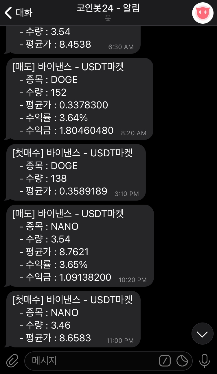 코인봇24는 텔레그램을 통해 봇의 매수 매도 정보를 실시간으로 알려줍니다.